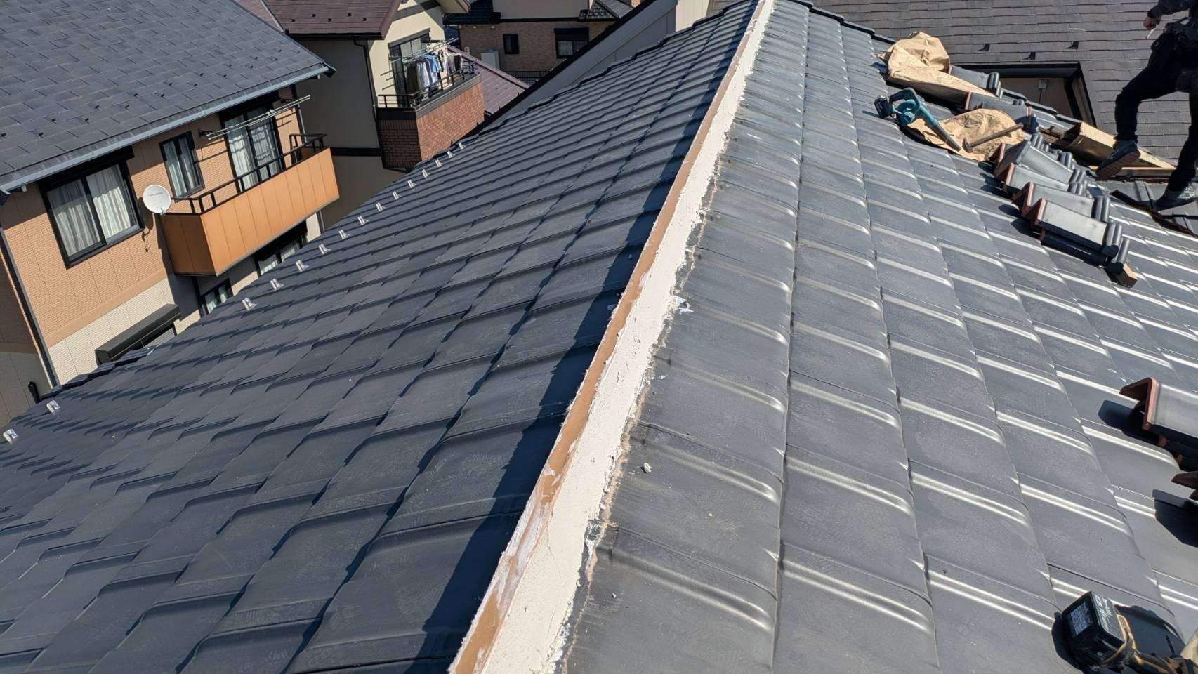 板金(ガルバ)屋根では棟板金、瓦屋根では棟瓦を取り付けます。